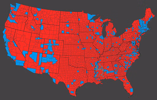 2024 թվականի ընտրությունների քարտեզ. Կապույտ գույնով տարածքները, որոնք ներկայացնում են Հարիսի ձայները, կարծես թե համընկնում են առաջարկվող SMART City ենթակառուցվածքային ցանցի հետ: Կարմիր գույնի տարածքները, որոնք ներկայացնում են Թրամփի ձայները, կարծես թե համընկնում են դաշնային ձեռքբերման և տեղափոխման համար դիտարկվող տարածքների հետ: Լրացուցիչ վերլուծություն է պահանջվում՝ որոշելու համար, թե արդյոք դաշնային ֆինանսավորման հատկացումները նախատեսված էին ապագա ընտրությունների վրա ազդելու՝ վերաբաշխման միջոցով:
