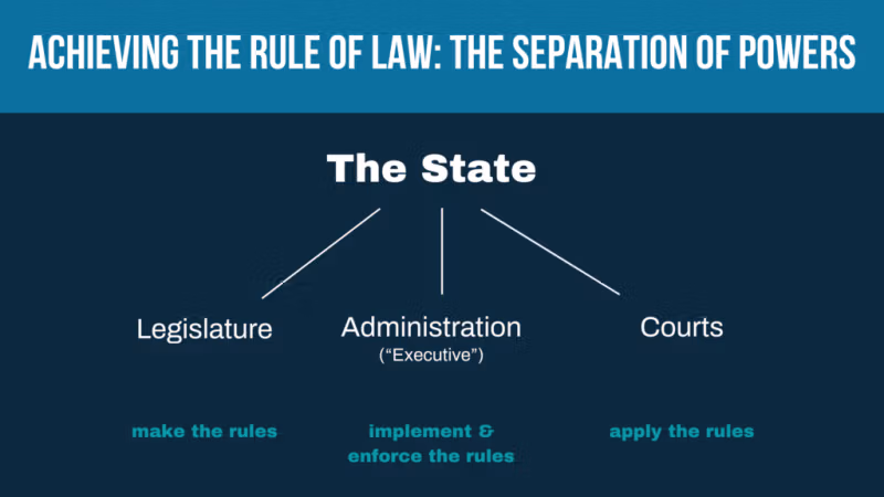 Երբ իշխանություններն իրարից բաժանված են, ոչ ոք ձեռքը ղեկին չի դնում։ Ոչ ոք չի կարող թելադրել, թե ինչ է լինելու կոնկրետ որեւէ պարագայում։ Օրենսդիրները չգիտեն, թե ապագայում ինչ վեճերի դեպքում կկիրառվեն իրենց կանոնները: Դատարանները պետք է կիրառեն այդ կանոնները գործերի նկատմամբ, երբ դրանք ծագեն: Պետական մարմինները պարտավորված են կանոններով, որոնք իրենք չեն կատարել: Ինչպես ասաց ավստրիացի տնտեսագետ և փիլիսոփա Ֆրիդրիխ Հայեկը Ազատության Սահմանադրություն«Դա այն պատճառով է, որ օրենսդիրը չգիտի այն կոնկրետ դեպքերը, որոնց նկատմամբ կկիրառվեն իր կանոնները, և այն պատճառով, որ դատավորը, ով կիրառում է դրանք, այլ ընտրություն չունի՝ եզրակացություններ անելու, որոնք բխում են գոյություն ունեցող կանոններից և կոնկրետ փաստերից։ դեպքում, որ կարելի է ասել, որ օրենքներն են իշխում, ոչ թե տղամարդիկ»։