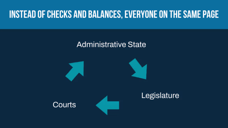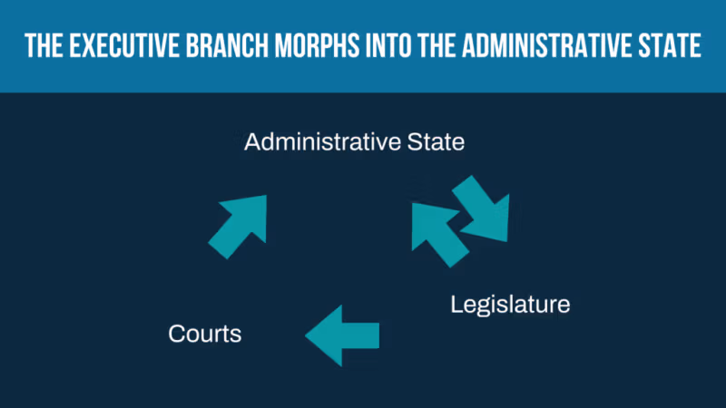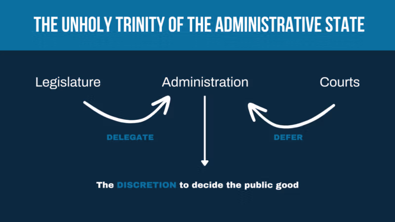 Օրենքի գերակայության փոխարեն մենք հիմա ունենք այն, ինչը դարձել է Վարչական պետության Սրբազան Երրորդություն։ Պատվիրակություն օրենսդիր մարմնից և դատարաններից զերծ մնալը արտադրում է հայեցողությամբ որպեսզի վարչակազմը որոշի հանրային բարիքը: