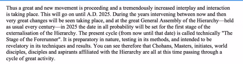 In Հիերարխիայի արտաքինացումՄի քանի տասնամյակների ընթացքում գրված և 1957 թվականին հրատարակված Բեյլին ուրվագծեց գլոբալ վերափոխման տեսլականը, որը զուգահեռ է ՄԱԿ-ի ներկայիս բազմաթիվ նախաձեռնություններին: Նրա գրվածքները նկարագրում էին փոփոխություններ, որոնք մենք այժմ տեսնում ենք. բարեփոխված կրթական համակարգեր, որոնք նպաստում են գլոբալ քաղաքացիությանը, բնապահպանական ծրագրերը, որոնք վերակառուցում են հասարակությունը, հոգևոր հաստատությունները միաձուլվում են համընդհանուր համոզմունքների մեջ, և տնտեսական համակարգերը դառնում են ավելի ու ավելի ինտեգրված: Հատկանշական է, որ նա նշել է 2025 թվականը որպես այս «հիերարխիայի էքստերնալիզացիայի» նպատակային ամսաթիվ. ժամանակացույց, որը համահունչ է բազմաթիվ ընթացիկ համաշխարհային նախաձեռնություններին, ներառյալ՝ ՄԱԿ-ի 2030-ի Կայուն զարգացման օրակարգը.