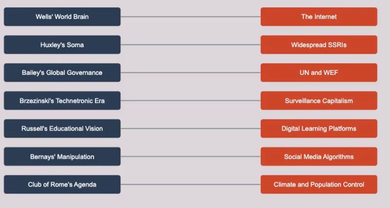 Մեր ներկայիս համակարգերում պատմական օրակարգերը դրսևորվել են ուշագրավ ճշգրտությամբ: Wells' World Brain-ը դարձել է մեր ինտերնետը, մինչդեռ Հաքսլիի սոման ընդունում է տարածված SSRI-ների ձևը: Համաշխարհային կառավարման մասին Բեյլի երազանքները ի հայտ են գալիս ՄԱԿ-ի և WEF-ի միջոցով, երբ Բժեզինսկու տեխնետրոնիկ դարաշրջանը գալիս է որպես հսկողության կապիտալիզմ: Ռասելի կրթական ուրվագիծը դրսևորվում է թվային ուսուցման հարթակներում, Բերնեյսի մանիպուլյացիայի տեխնիկան հզորացնում է սոցիալական մեդիան, և Հռոմի ակումբի բնապահպանական մտահոգությունները խթանում են կլիմայի փոփոխության քաղաքականությունը: Յուրաքանչյուր պատմական նախագիծ գտնում է իր ժամանակակից իրականացումը` ստեղծելով վերահսկողության կոնվերգենտ ցանցեր:
