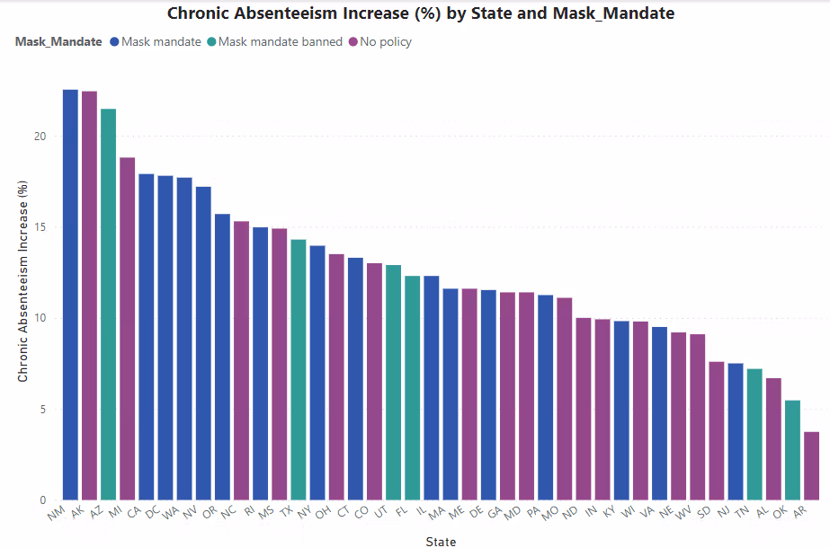 Նոր նախապատմություն դուրս է եկել Ստենֆորդի պրոֆեսորից, որը վերլուծում է քրոնիկ բացակայության մակարդակը համաճարակից առաջ և հետո: Թերթը վերլուծել է դիմակների մանդատները, գրանցման փոփոխությունները և պետական մակարդակով քրոնիկ բացակայության տոկոսային աճը: Ստորև բերված է գծապատկեր, որը ցույց է տալիս աճը 2018/19 ուսումնական տարվա և 2021/22 ուսումնական տարվա միջև: