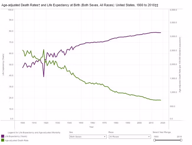 ԱՄՆ-ի տարիքային ճշգրտված մահացության մակարդակը 2020 թվականին (828 100,000-ից) իրականում եղել է. 67% ավելի ցածր, քան եղել է 1918 թվականին (2,542 100,000-ին), քանի որ այդ ժամանակից ի վեր ազատ կապիտալիստական հասարակությունը ազգին շնորհել է բարգավաճում և առաջընթացի ազատություն, ինչը հանգեցրել է ավելի լավ սանիտարական պայմանների, սնուցման, ապաստանի, ապրելակերպի և բժշկական խնամքի: